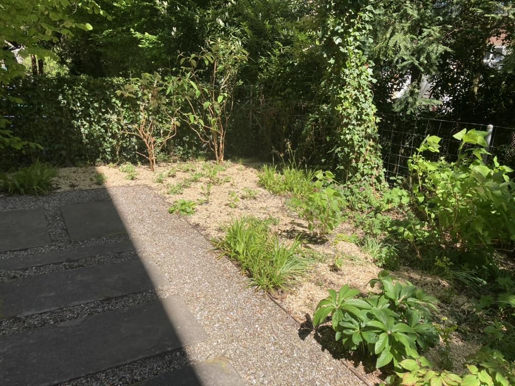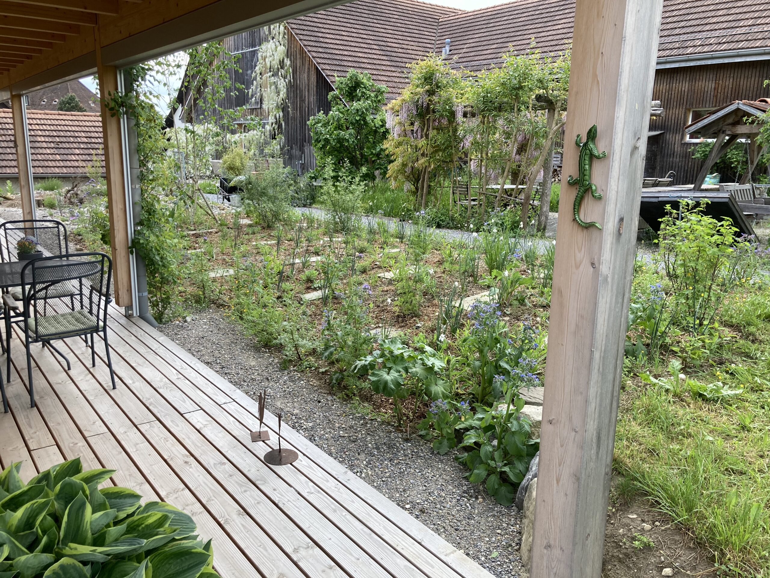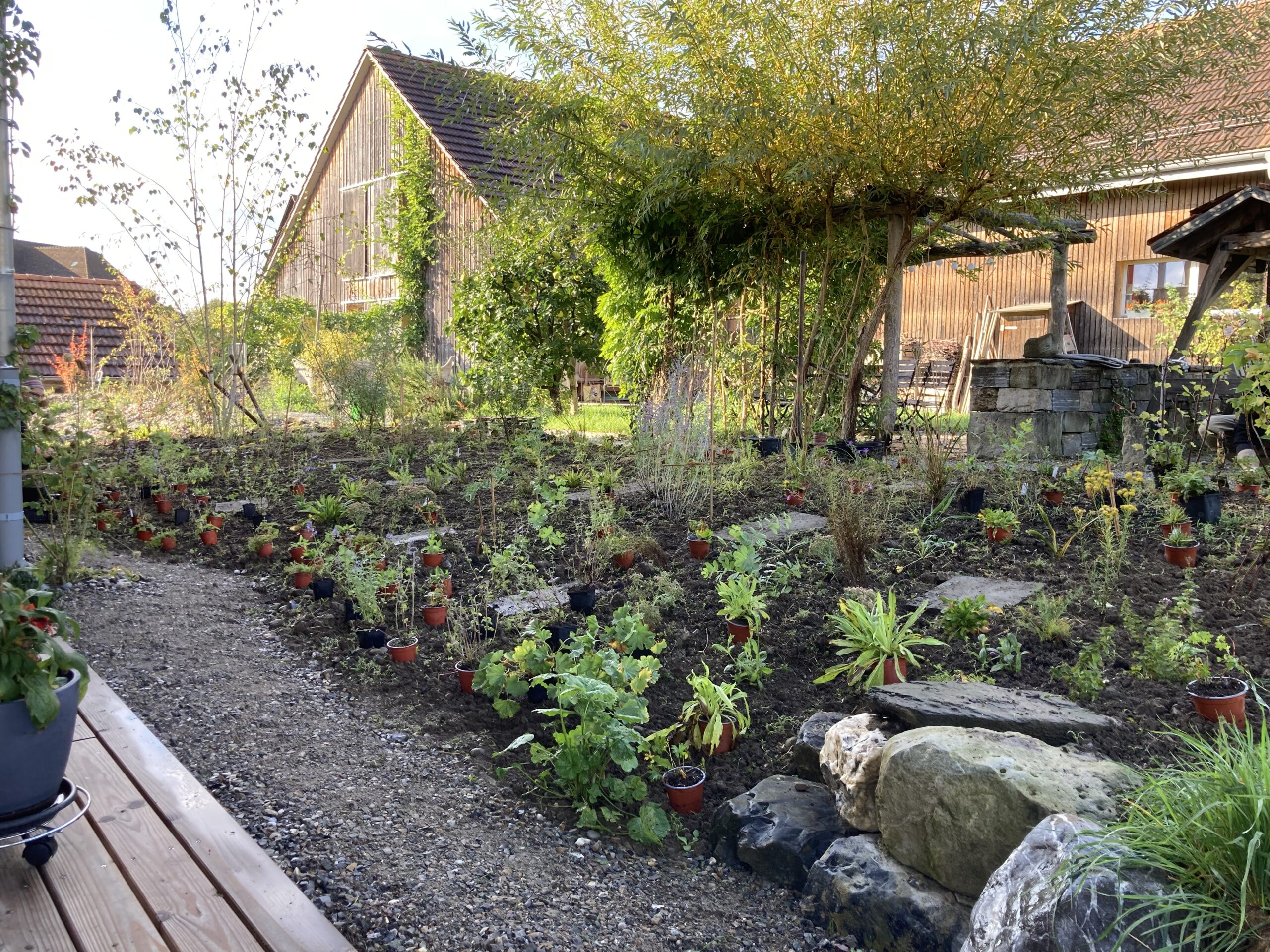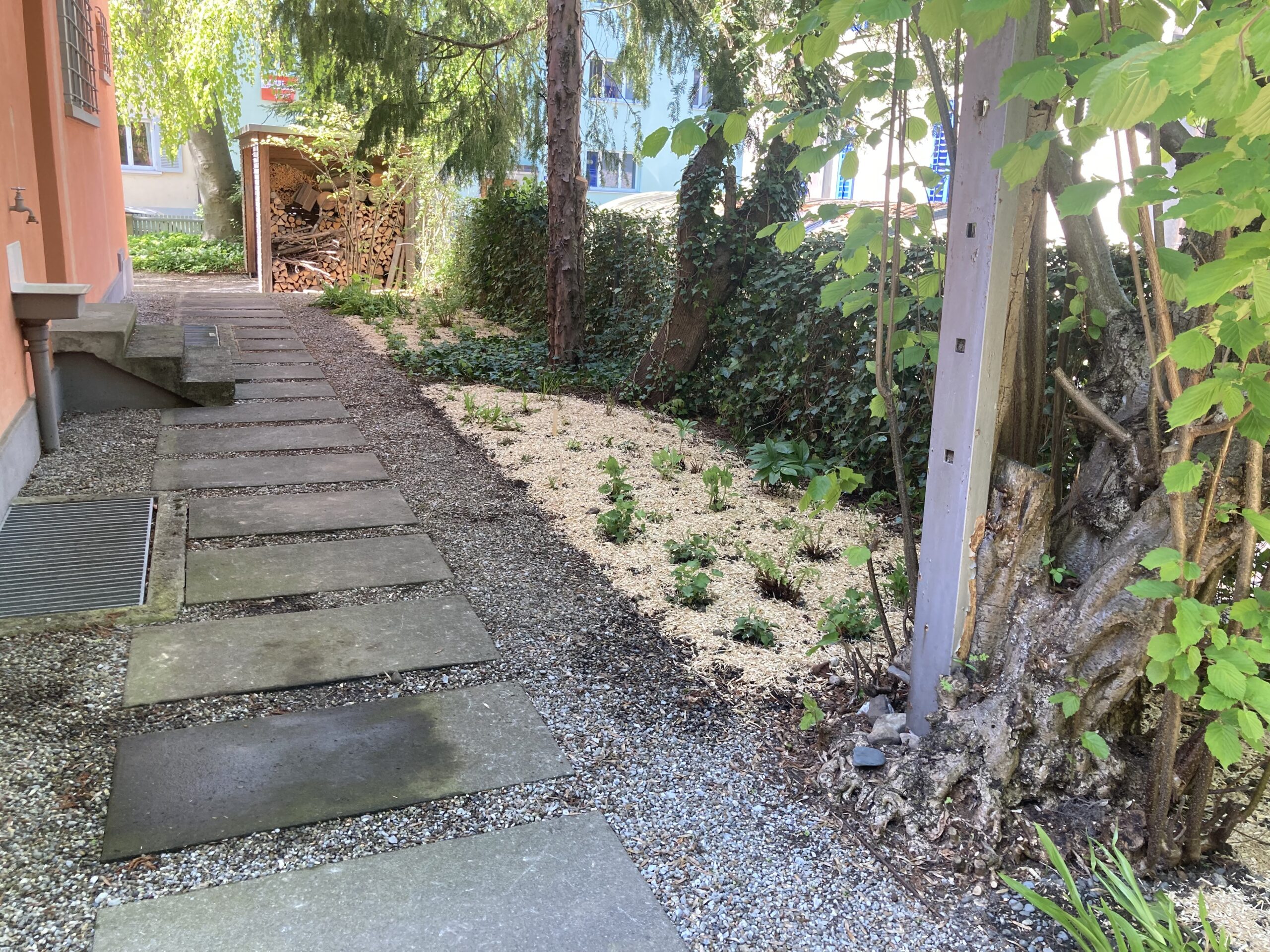 Eine Kombination von alter und neuer Bepflanzung, die bestehenden Pflanzen wurden während dem Umbau in Kisten gelagert